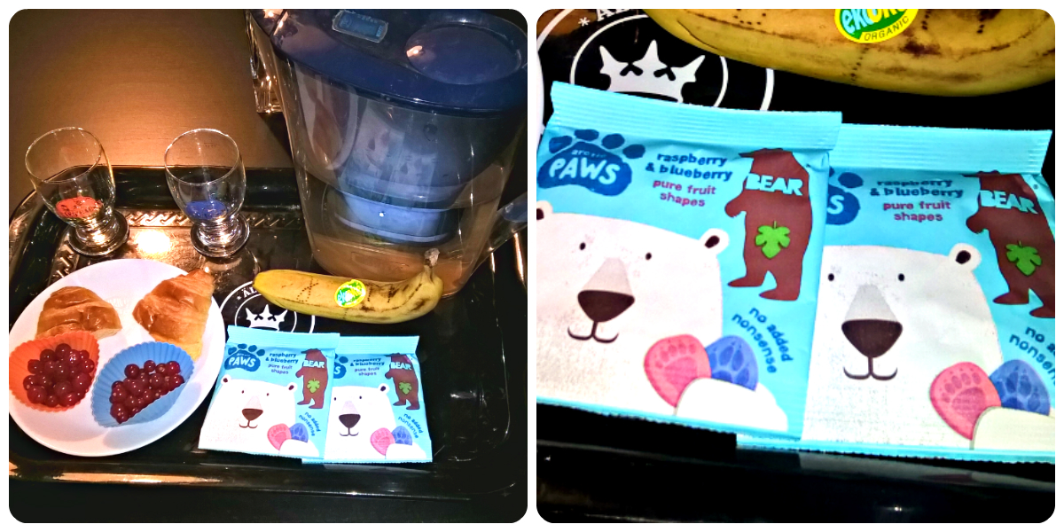 In the morning, some redcurrants awaited my offsprings. Half a croissant and a small pack of raspberry & blueberry  bear paws for each were put on the platter as well, together with some filtered water. A meal fit for a king!