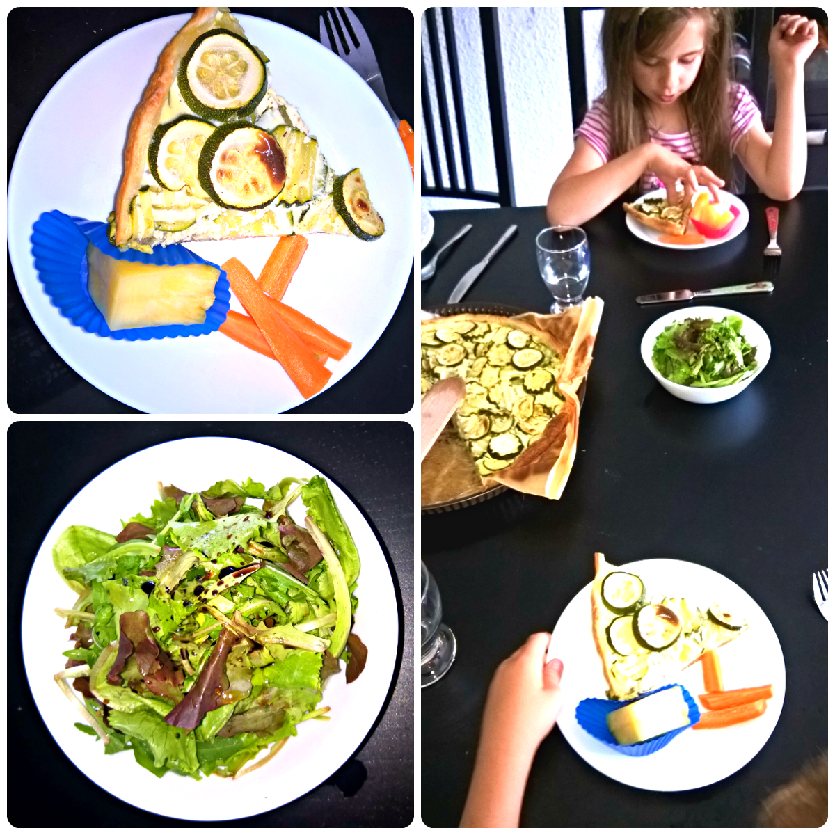 Zucchini quiche was our choice for lunch and the children actually helped make it. They cut the zucchini with their crinkle knives, arranged the slices onto the though, and after preparing the egg mixture, poured it all over.