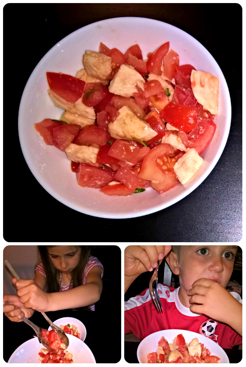 Dinner was thrown together in a matter of minutes. Hot summer days are perfect for a caprese salad, which both my children adore and frequently demand. Some diced tomatoes together with cubed mozzarella and fresh basil leaves is easy-peasy to pull off so we gladly oblige.Sat dinner 686x1024 - What my kids eat in a week - 3-10 June