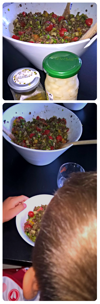 For lunch we had another staple of ours, a bowl of lentil salad – the only cooked ingredient is the lentils, all the rest is just chopped and thrown in. A generous amount of olive oil, aceto balsamico and dijon mustard vinaigrette is poured over it. Capers and pickled onions are at the disposal of the bravest, as well. I discovered it years ago while dining out in a local Pret-a-manger-style chain, reinterpreted it to our taste and have been regularly serving it since.