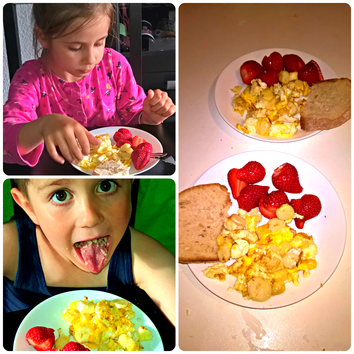 Scrambled eggs with white asparagus was our Thursday dinner, a slice of bread to make sure no tummies were left empty. Strawberries were added to make the pictures more colourfull. 🙂